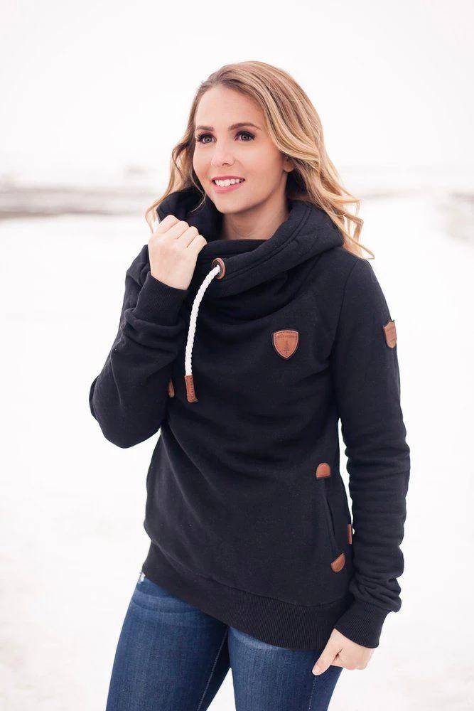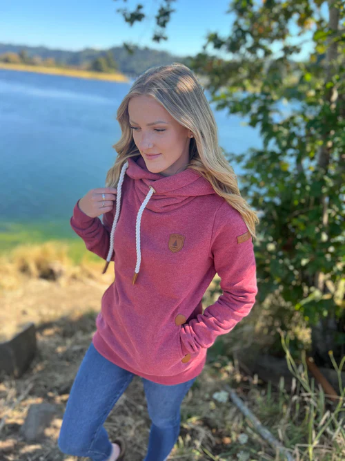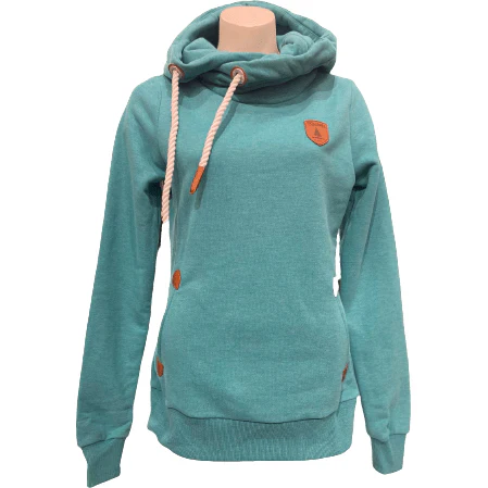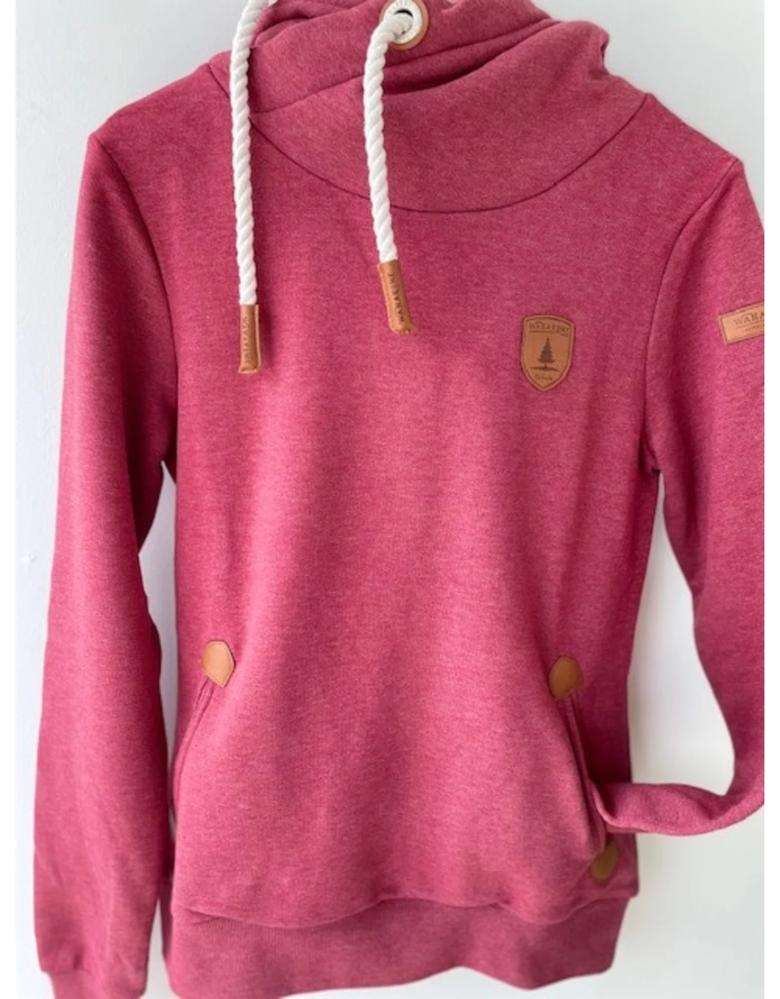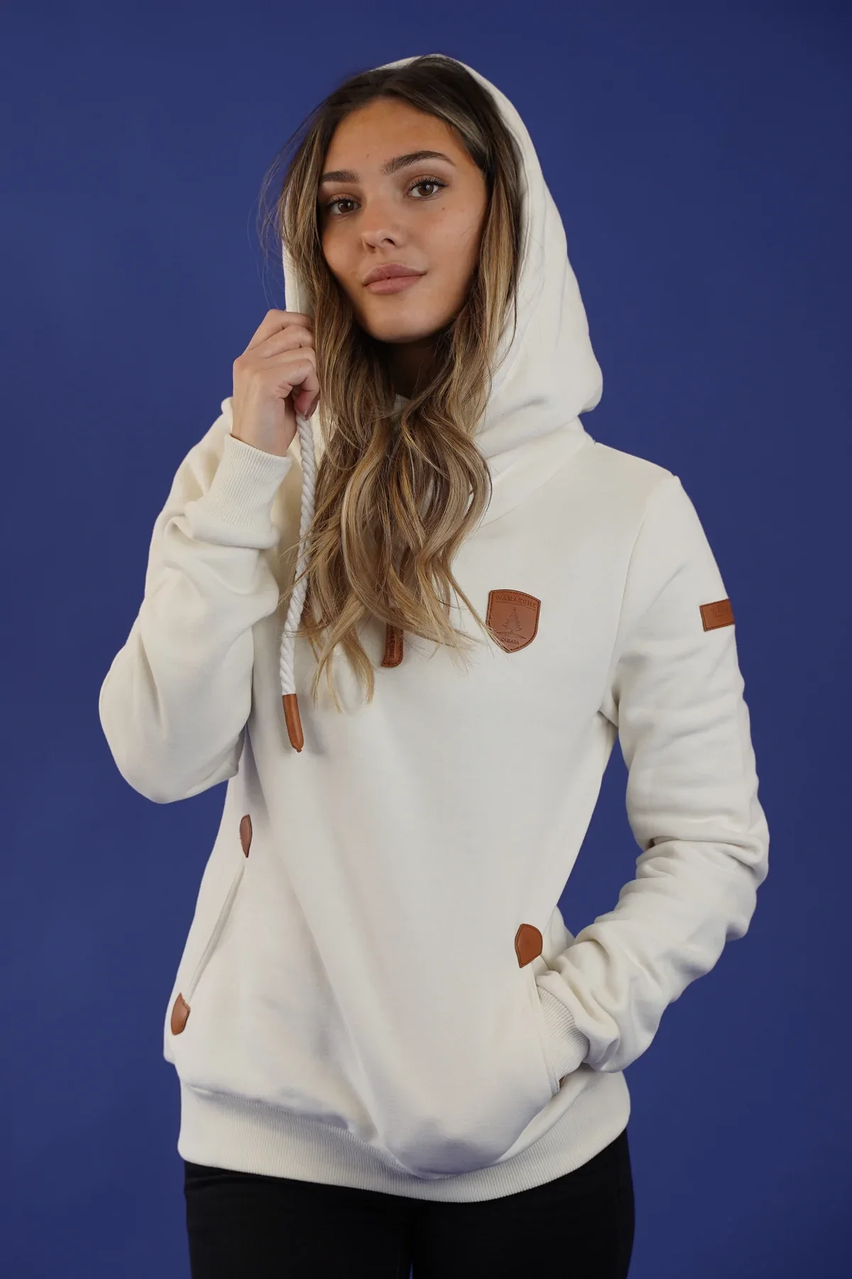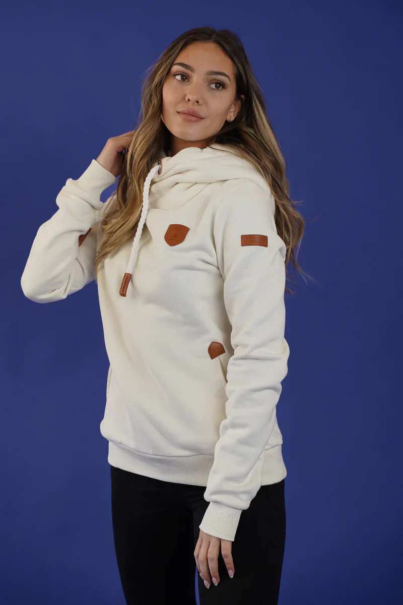Capuche à col bénitier avec cordons de serrage réglables et casquettes en cuir végétalien. Logo patch Wanakome en cuir végétalien brodé sur la poitrine et la manche Intérieur en French Terry brossé .Poches avant avec détails en cuir végétalien.