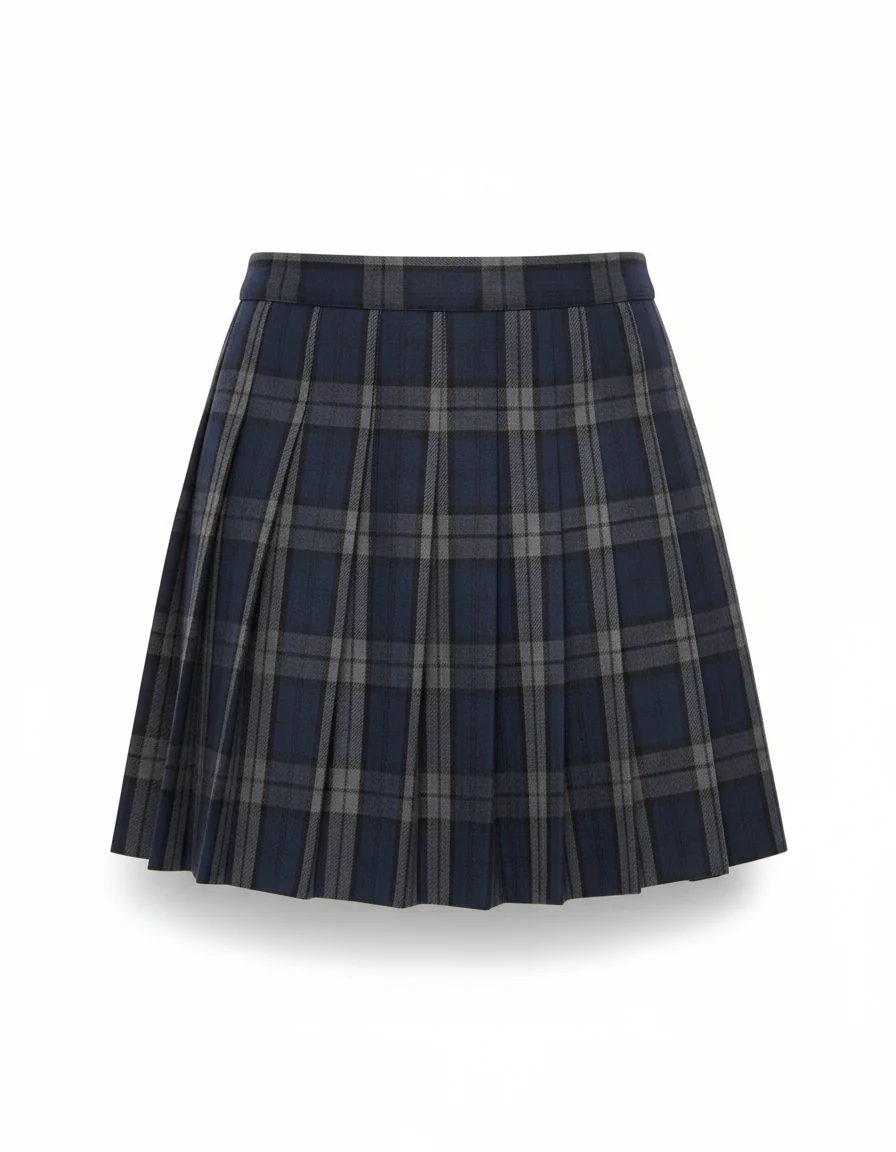 Cette jupe présente un motif à carreaux et une coupe plissée. Sa longueur est courte, se situant au-dessus du genou.