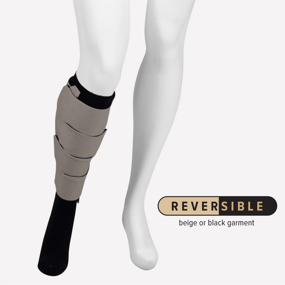 The Juzo Compression Calf Wrap offers high working pressure (30-60 mmHg) in a versatile garment that features a reversible design, easy pull tabs, minimal overlying straps and special notches that resist gapping and bulk.